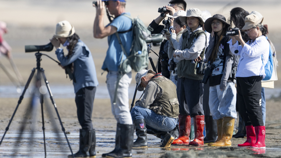 2025年11月9日,中外观鸟爱好者在泉州围头湾滩涂上观测勺嘴鹬。新华社记者 魏培全 摄